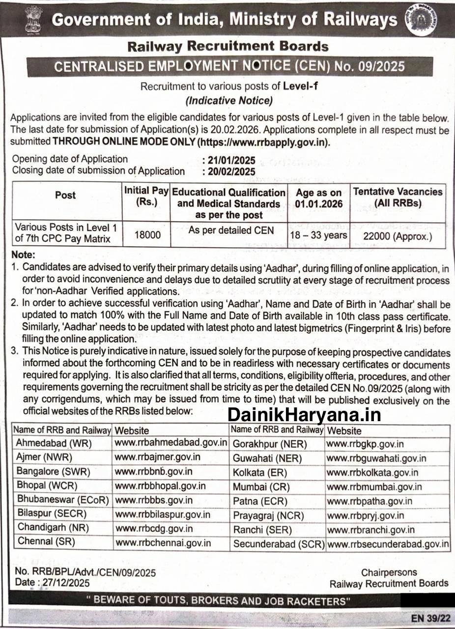 रेलवे रिक्रूटमेंट बोर्ड द्वारा रेलवे ग्रुप डी की 22000 पदों पर भर्ती का नोटिफिकेशन जारी किया गया है. यह भर्ती विज्ञापन संख्या 09/2025 के तहत लेवल -1 Group D के पदों पर निकाली गई है. इस भर्ती के लिए कक्षा दसवीं पास और आईटीआई पास उम्मीदवार आवेदन कर सकते हैं. आवेदक से संबंधित जानकारी नीचे दी गई है.